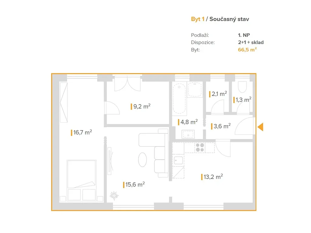 / Byt 1 (1. NP): 2+1 s terasou (66 m²)