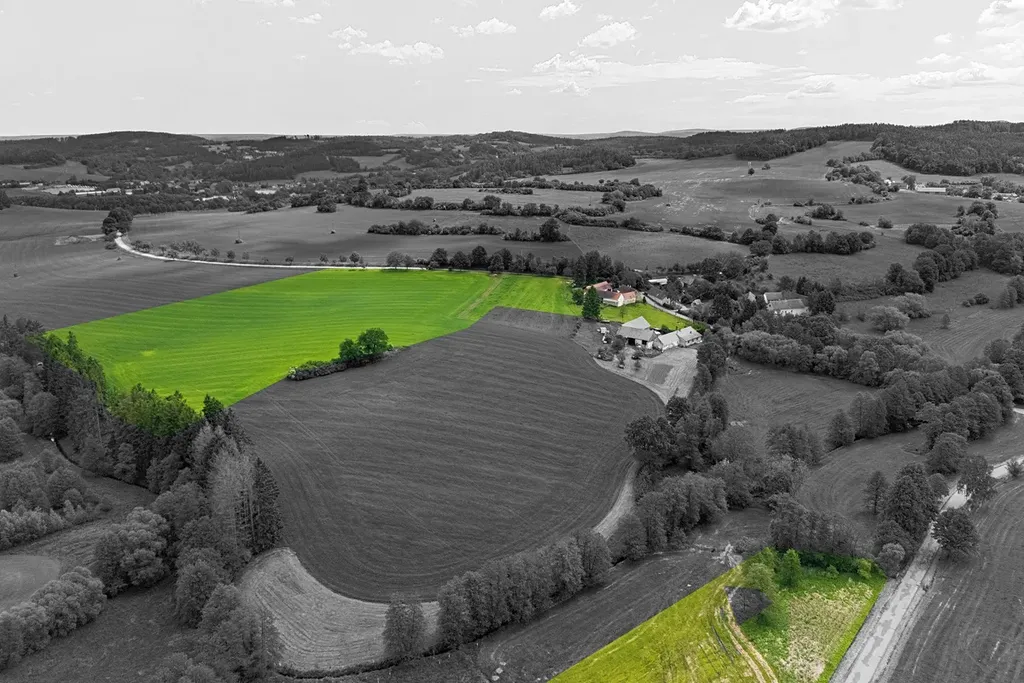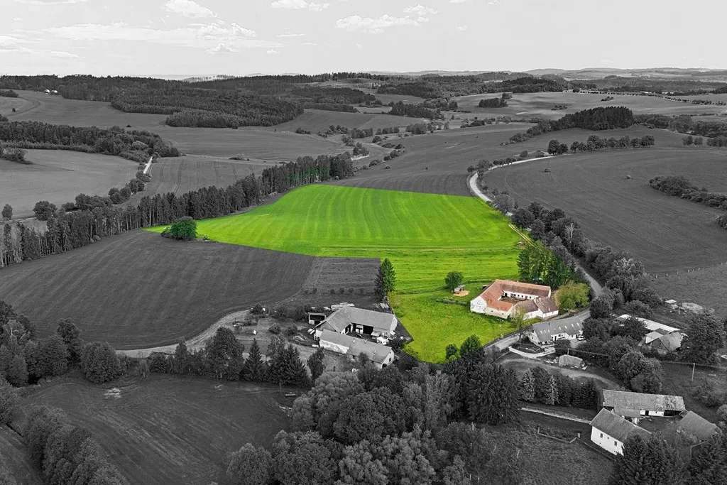 • 60 188 m² přímo navazujících pozemků na usedlost (zastavěná plocha a nádvoří 1152 m², orná půda 54886 m², zahrada 2982 m², ostatní plocha 1168 m²)