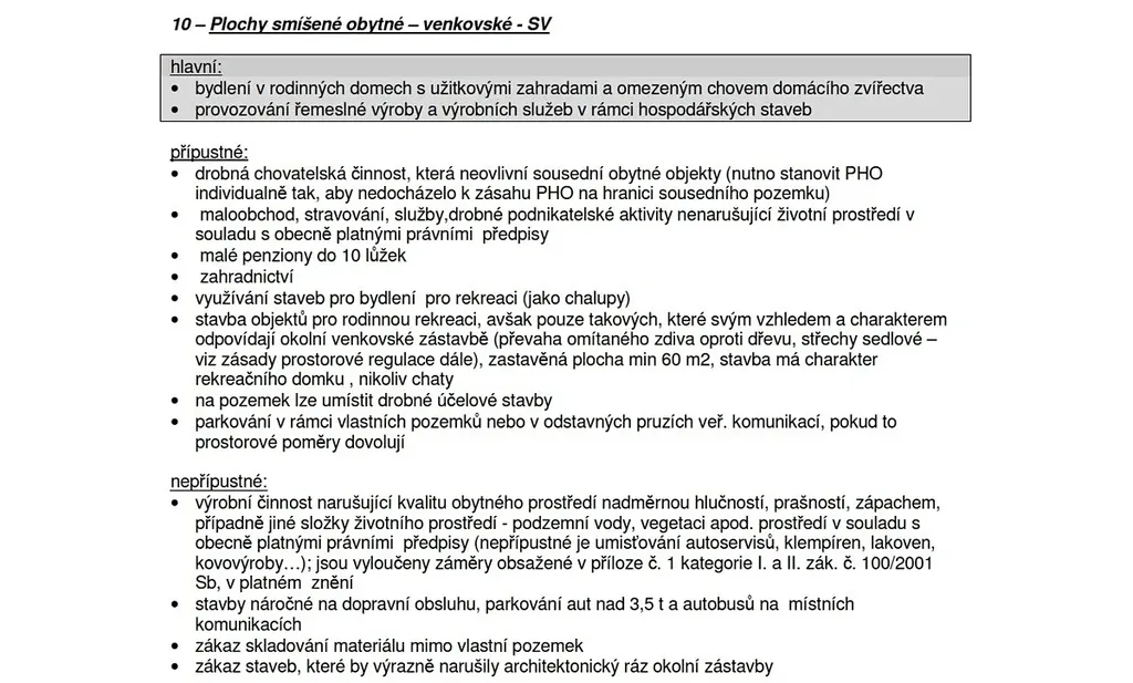 • využití pro bydlení, řemesla, zahradnictví, penzion do 10 lůžek, drobnou výrobu nebo chov zvířat v rámci hospodářství.