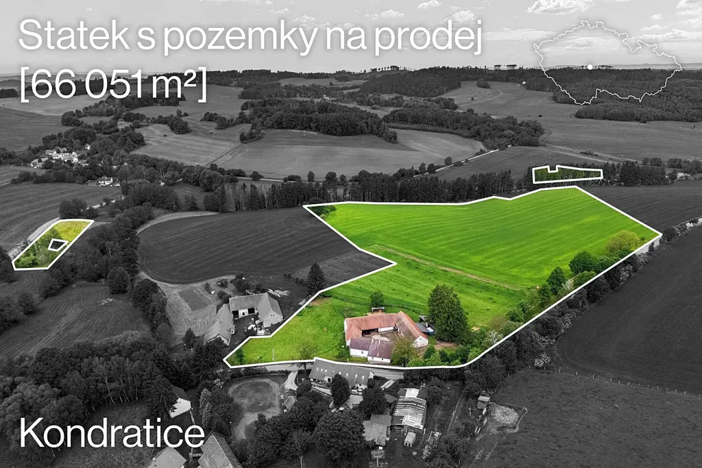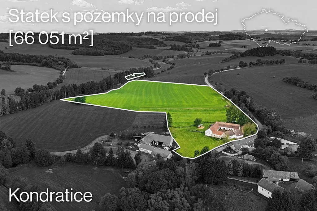 Zemědělská usedlost v malé vesničce Kondratice u Popovic nedaleko Benešova s celkovou plochou pozemků 66051 m² a užitné plochy budov celkem 718 m²