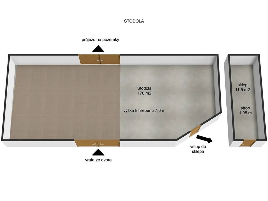 • Stodola o velikosti 170 m², se sklepem 11,5 m² (navazující a průjezdná na polnosti)