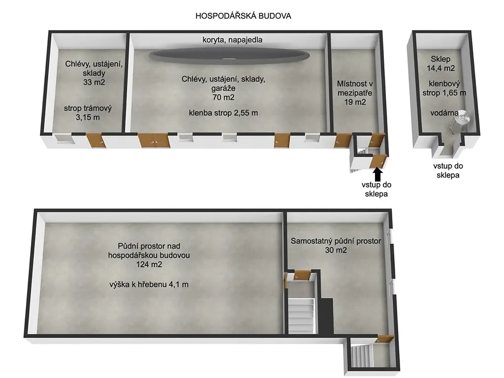 • Skladová hospodářská budova: 122 m², půda 150 m², sklep 14,4 m²