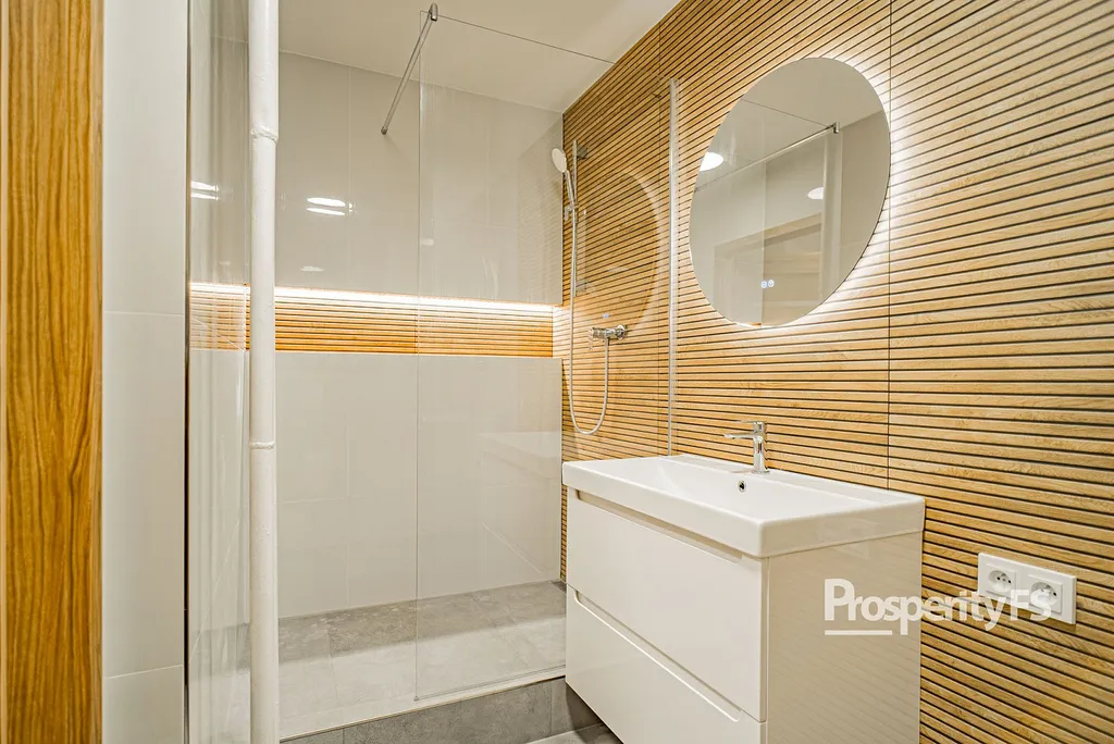 Byt je po kompletní rekonstrukci v roce 2025 a nabízí moderní, promyšlené a čisté bydlení bez nutnosti dalších investic. Nová kuchyňská linka v lesklém bílém designu je vybavena vestavnými spotřebiči a koupelna zaujme sprchovým koutem se žlábkem i místem pro pračku a sušičku s digitálním zrcadlem.