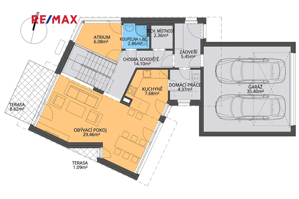 • Praktické detaily: Součástí je dvougaráž s přímým vstupem do domu a dvě další venkovní parkovací stání. Samozřejmostí je technická místnost pro technologie.