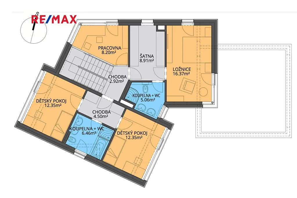 Prémiový rodinný 6+kk, dvougaráž, tři koupleny, tři toalety, technická místnost a místnost pro domácí práce. Z rodičovské ložnice přímí vstup do šatny a samostatné koupelny.