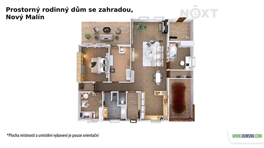 Nabízíme k prodeji velmi příjemný a prakticky řešený přízemní rodinný dům typu bungalov, kolaudovaný v roce 2012, nacházející se v klidné a moderní zástavbě obce Nový Malín. Dům o dispozici 4+kk je chytře rozdělen na denní a noční část, což zajišťuje komfortní bydlení i dostatek soukromí pro celou rodinu. Dominantou denní části je prostorný obývací pokoj s kuchyňským koutem o výměře téměř 55 m², ze kterého je přímý vstup na terasu a rovinnou zahradu ideální velikosti. Součástí této části domu je také pracovna a dostatek praktických úložných prostor. Noční část nabízí koupelnu s vanou i sprchovým koutem, ložnici, dětský pokoj, samostatnou toaletu a technickou místnost se vstupem na zahradu, která rovněž poskytuje další úložné zázemí. Součástí domu je garáž a před domem se nachází vydlážděný vjezd s možností pohodlného parkování.