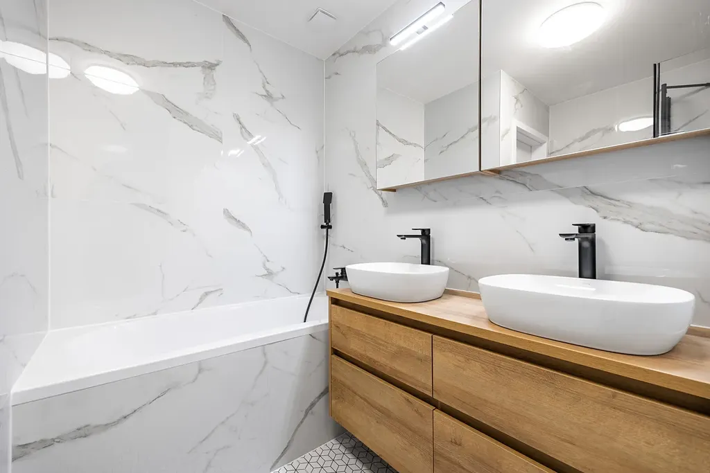 - nová sanita (vana, sprcha, 2 umyvadla, skříňka, toaleta)