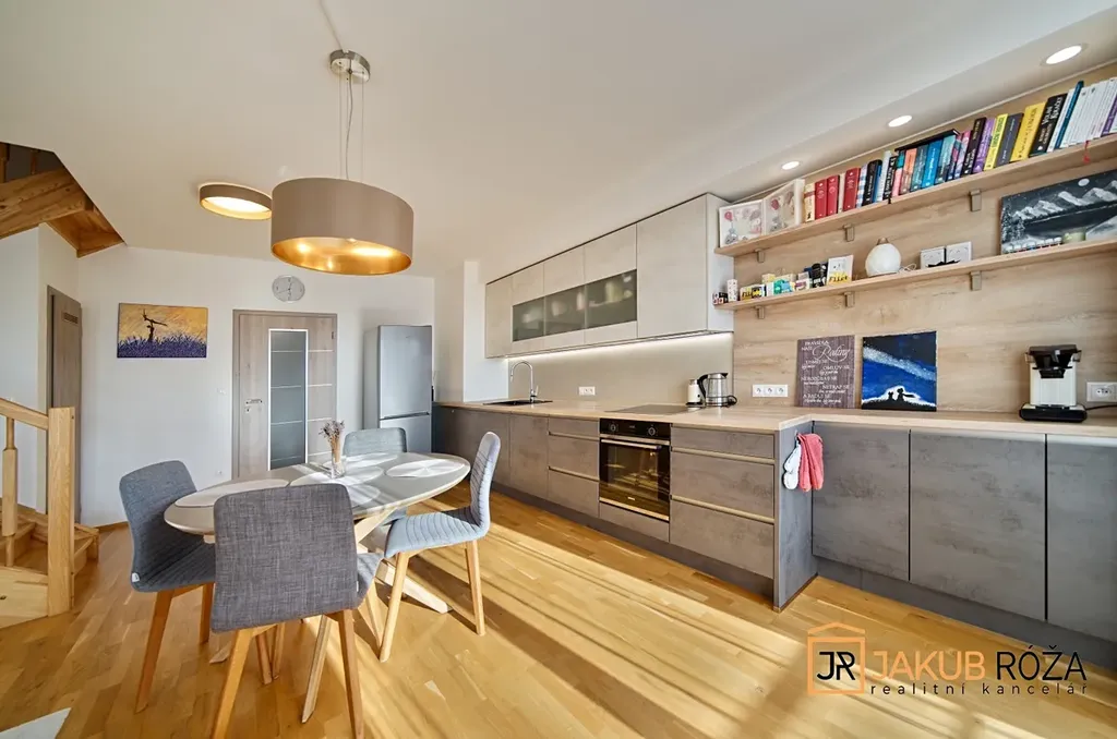 Dispozice je řešena velice prakticky. Na vstupní chodbu navazuje komora, toaleta a prostorný jižně orientovaný obývací pokoj s kuchyňským koutem a balkonem. Z obývacího pokoje se lze po masivním dřevěném schodišti dostat do dalšího podlaží, kde je umístěna koupelna s vanou a toaletou, a dva samostatné pokoje. Navíc byt obsahuje dveřmi uzavíratelné prostory dole pod schody a nahoře vedle jednoho z pokojů.