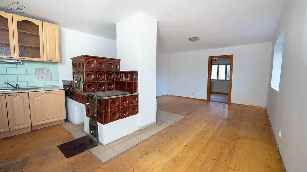 Srdcem domu je prostorný obývací pokoj s krásnými kachlovými kamny, která vytvářejí jedinečnou atmosféru. Společně s kuchyní a dalšími dvěma pokoji je tato část domu plně obyvatelná. Na podlahách jsou dřevěné podlahy, které interiéru dodávají teplo a útulnost.