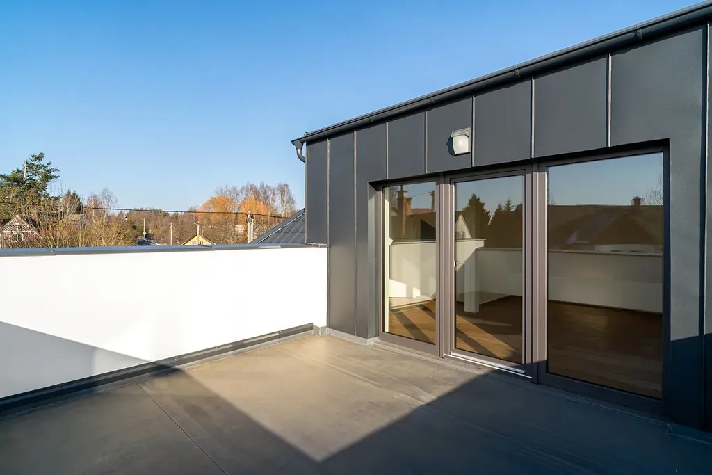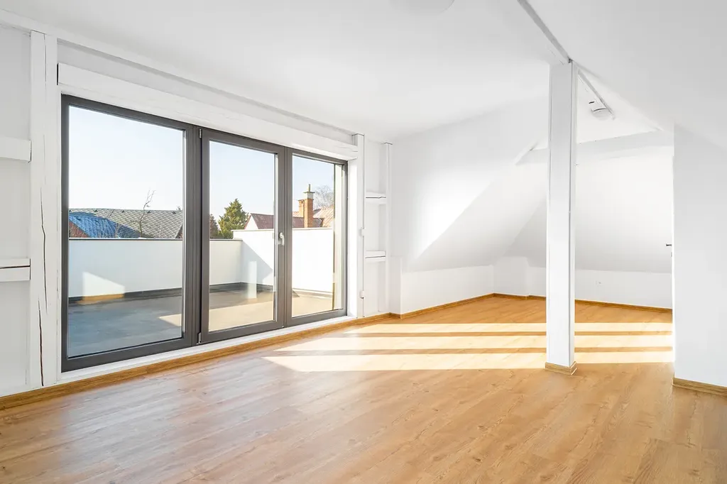 V podkroví je další prostorný pokoj s přístupem na terasu 15,5 m², vhodný například jako pracovna, ateliér nebo pokoj pro hosty.