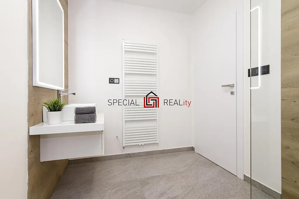 - dům nabízí dvě koupelny, v přízemí s walk-in sprchovým koutem a samostatným WC, v patře s volně stojící vanou, walk-in sprchovým koutem a WC