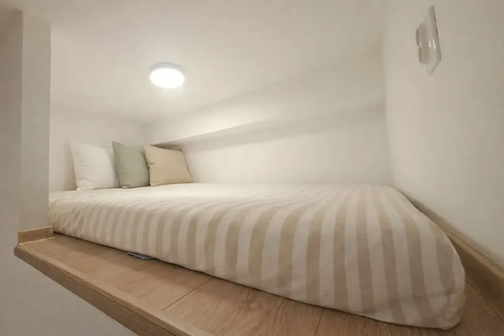 Byt je rozdělen na hlavní obytnou část s kuchyňským koutem a spací patro, které nabízí potřebné soukromí pro odpočinek.