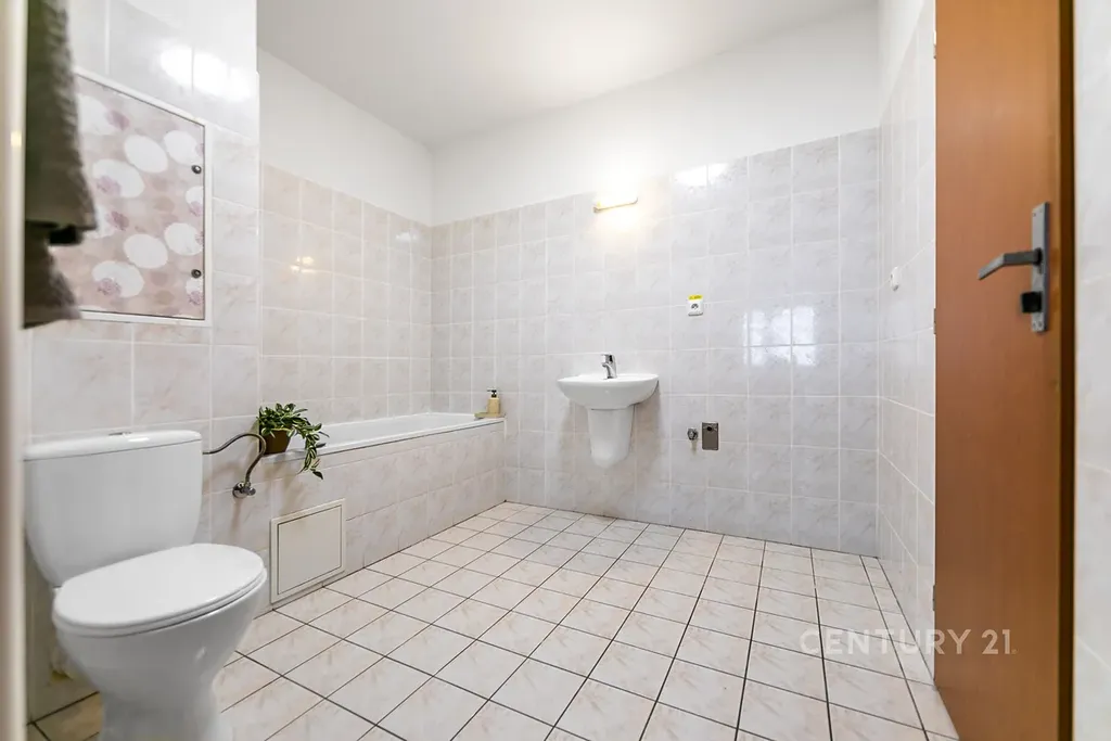 koupelna s vanou, umyvadlem a WC, s prostorem pro pračku, sušičku i koupelnovou skříňku