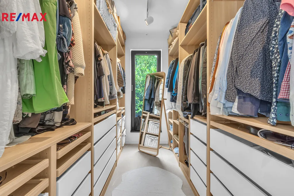 Vnitřní vybavení domu - zn. Kuchyně zn. SYKORA s pracovní deskou na míru z kamene Dekton 6cm se zapuštěným granitovým dřezem, spotřebiče Electrolux, AEG (parní trouba a vestavěný kávovar, myčka a lednice), designová digestoř ELICA. Krbová kamna STORCH VULSINI s přisáváním vzduchu, nerezový komín tříplášťový, el. regulace. Jídelní stůl masiv a židle zn. TON, dub. Značková osvětlovací tělesa INTRO LUCE na d.o.. Dveře zn. SAPELI elegant, bezfalcové provedení se značkovým kováním zn. TUPAI DEDOS. Na chodbě a v ložnici nábytek na míru zn. SYKORA. Koupelna SOLITÉR, HANSGROHE, PURAVIDA a ALESSI. Vypínače a zásuvky zn. ROON dotykové. Vnitřní parapety žulové. Podlahy jsou v kombinaci vinylu a dlažby.