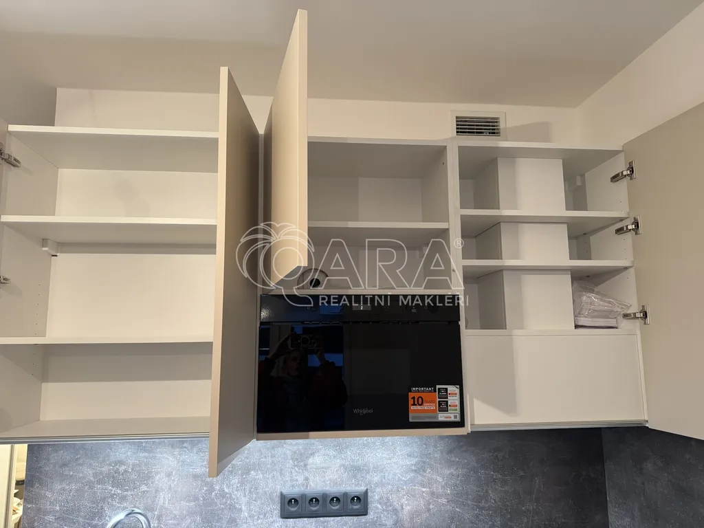 Dispozici bytu tvoří vstupní chodba s vestavěnou skříní, hlavní obytná místnost s kuchyňským koutem a rekuperační jednotkou a dále koupelna se sprchovým koutem a toaletou. Kuchyňská linka je plně vybavena spotřebiči – k dispozici je myčka, mikrovlnná trouba, trouba, elektrická varná deska a digestoř. Lednice s mrazákem bude dodána. V koupelně je k dispozici pračka.