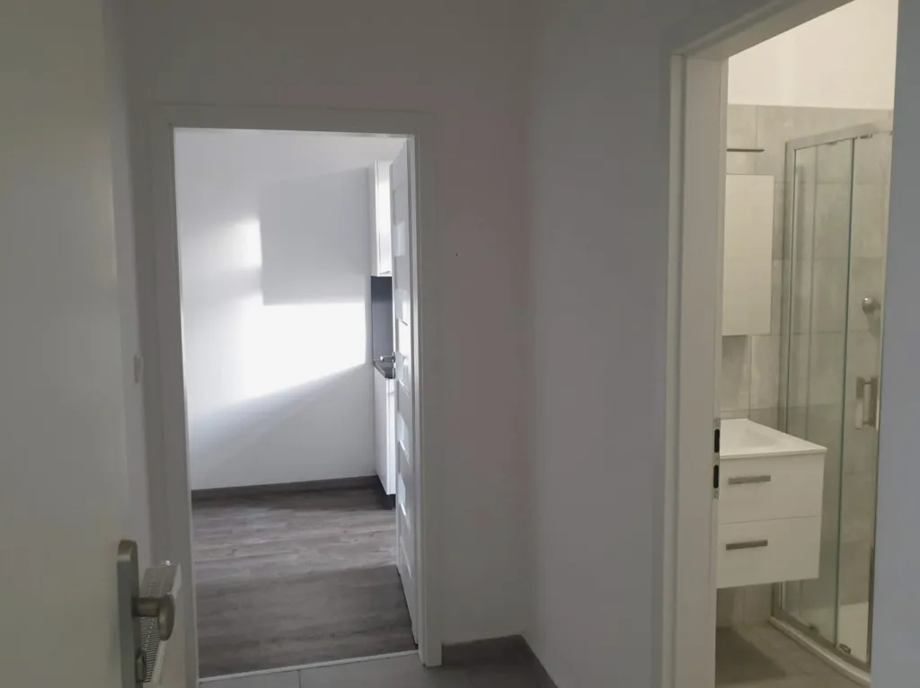 Byt má praktické uspořádání – prostorný pokoj, který lze využít jako ložnici s obývacím koutem, a samostatnou kuchyň s kompletně vybavenou linkou (varná deska, trouba, myčka, lednice). Koupelna je vybavena sprchovým koutem, umyvadlem a toaletou.