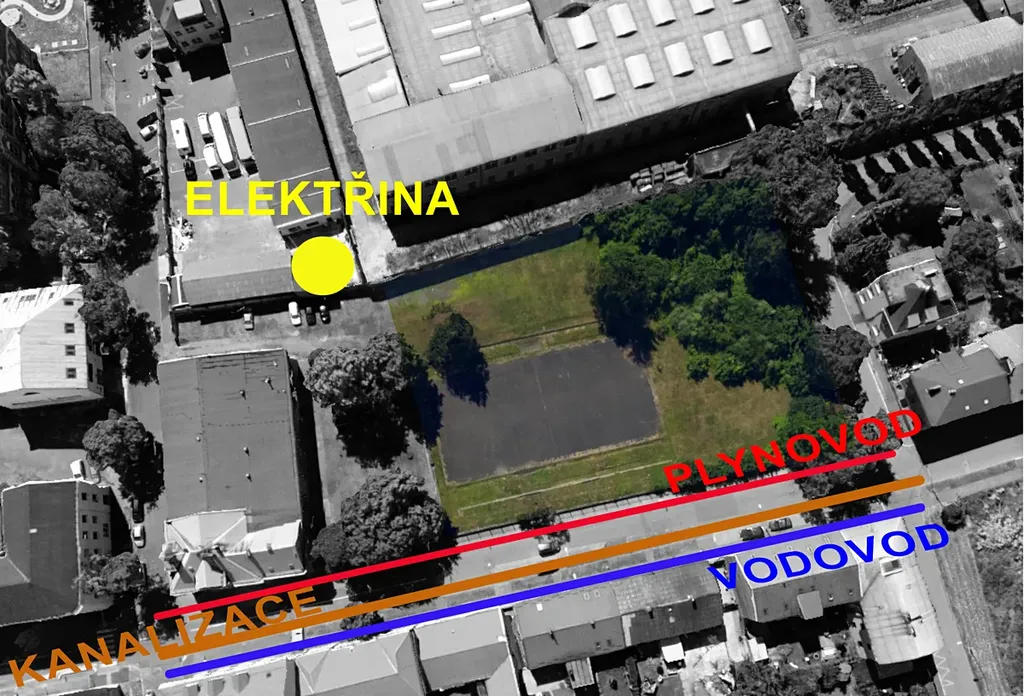 Pozemek je oplocený a nachází se v lokalitě s kompletní dostupností inženýrských sítí (elektřina, plyn, obecní vodovod, kanalizace) v bezprostřední blízkosti. Na pozemku samotném nejsou inženýrské sítě, což umožňuje maximální flexibilitu využití.