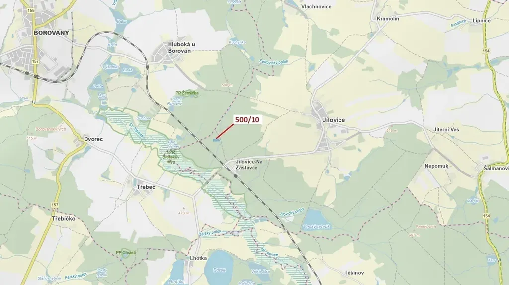 Lesní pozemek o výměře 5 755 m2, parcelní číslo 500/10, podíl 1/1, katastrální území Jílovice u Trhových Svinů, obec Jílovice, obec s rozšířenou působností Trhové Sviny, okres České Budějovice, Jihočeský kraj. Po těžbě.