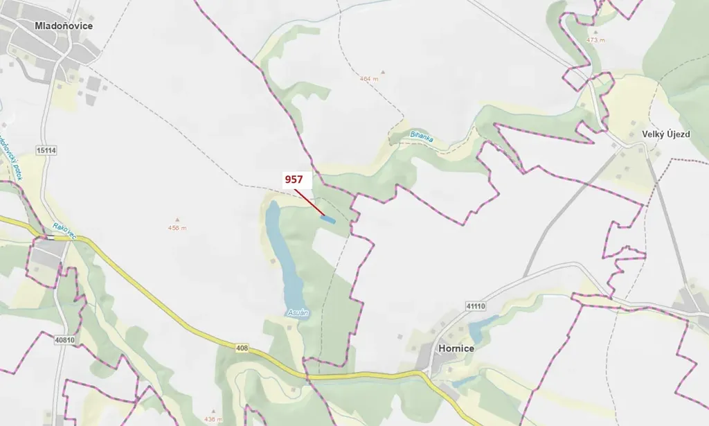 Lesní pozemek o výměře 2344 m2, parcelní číslo 957, podíl 1/1, katastrální území Mladoňovice na Moravě, obec Mladoňovice, obec s rozšířenou působností Moravské Budějovice, okres Třebíč, Kraj Vysočina.