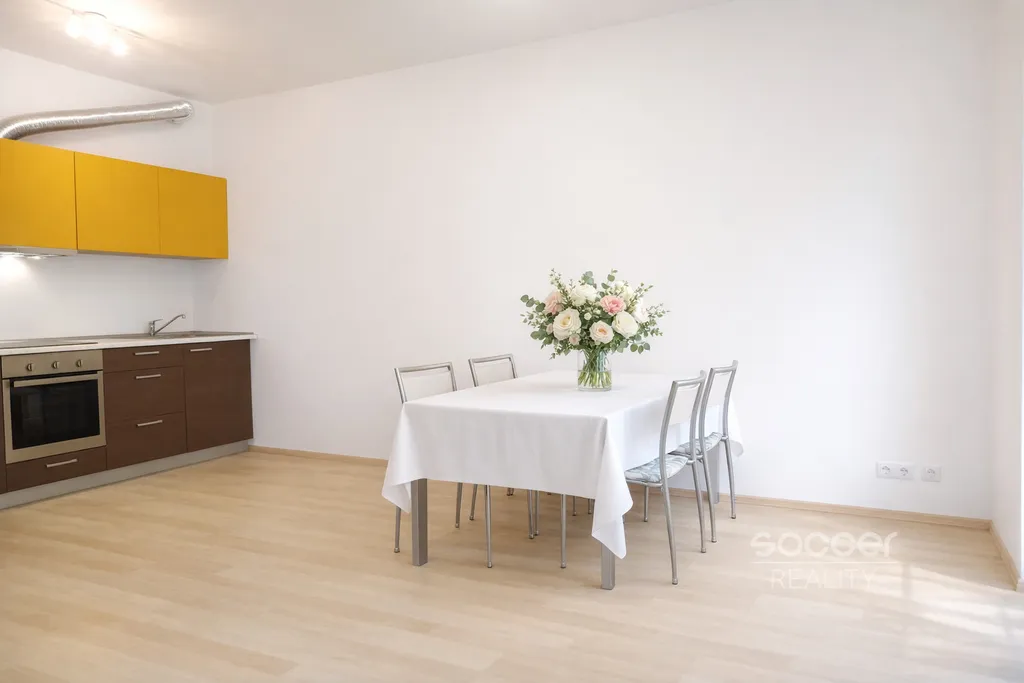 Byt je kompletně vybaven a připraven k okamžitému užívání. K dispozici je moderní kuchyňská linka, lednice, elektrická trouba, keramická varná deska, pračka, pohodlná sedačka, komoda a jídelní stůl se židlemi.