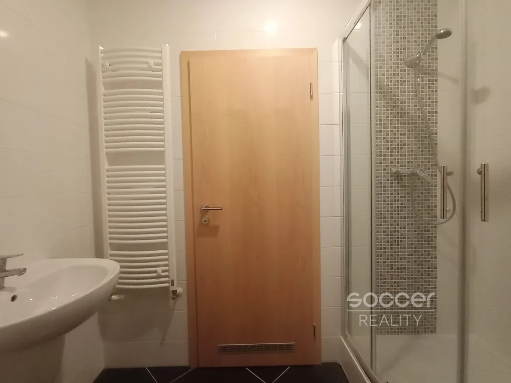 Koupelna je vybavena sprchovým koutem a žebříčkovým radiátorem, WC je samostatné.