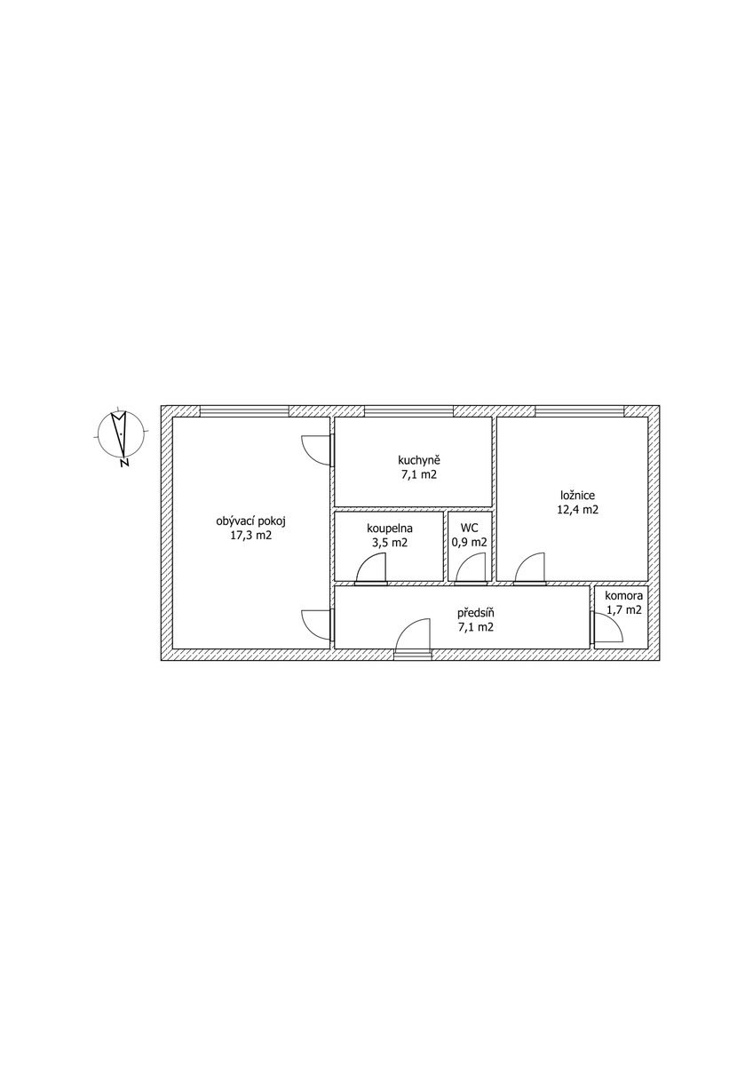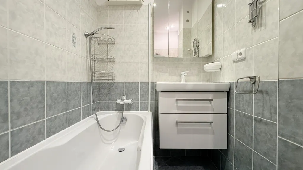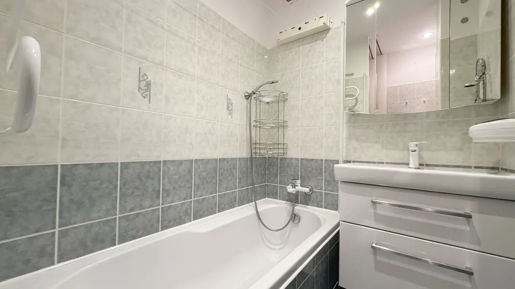 Obytné místnosti jsou světlé, orientované na jih a poskytují hezký výhled do okolní zeleně; přímo za domem je dětské hřiště. Byt se pronajímá kompletně vybavený. V ložnici se nachází manželská postel a velká vestavěná skříň, v předsíni další vestavěná skříň. Obývací pokoj je zařízen sedací soupravou, konferenčním stolkem, PC stolem a úložnými skříňkami. Kuchyně je vybavena lednicí, vestavnou troubou, indukční varnou deskou, mikrovlnnou troubou, digestoří a kuchyňskou linkou na míru. Koupelna má vanu a pračku. WC je samostatné. Vstup do bytu zajišťují bezpečnostní dveře. Součástí bytu je sklepní kóje o rozloze 2 m2.