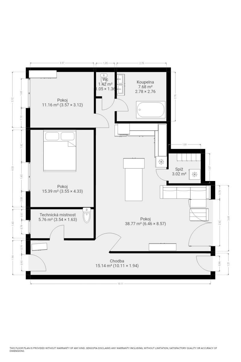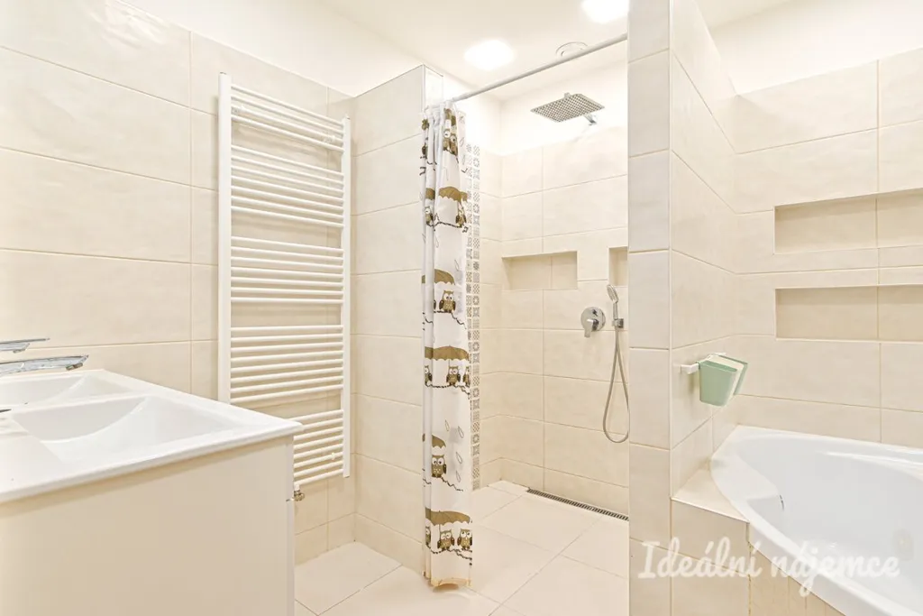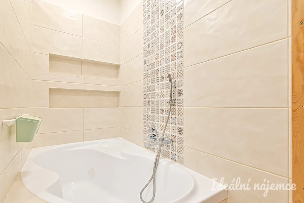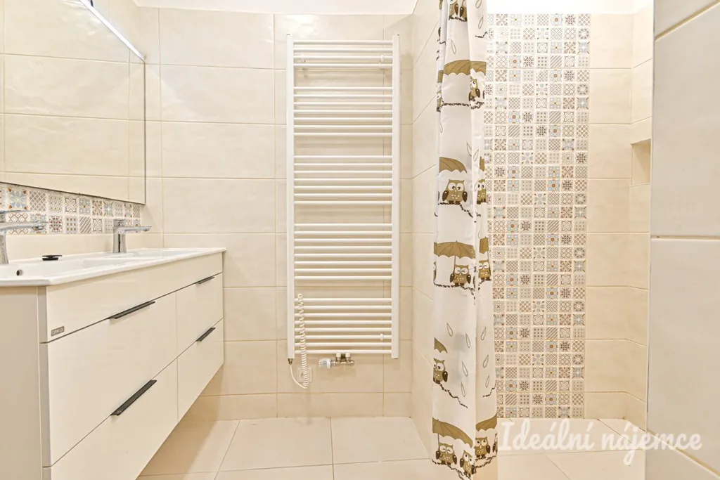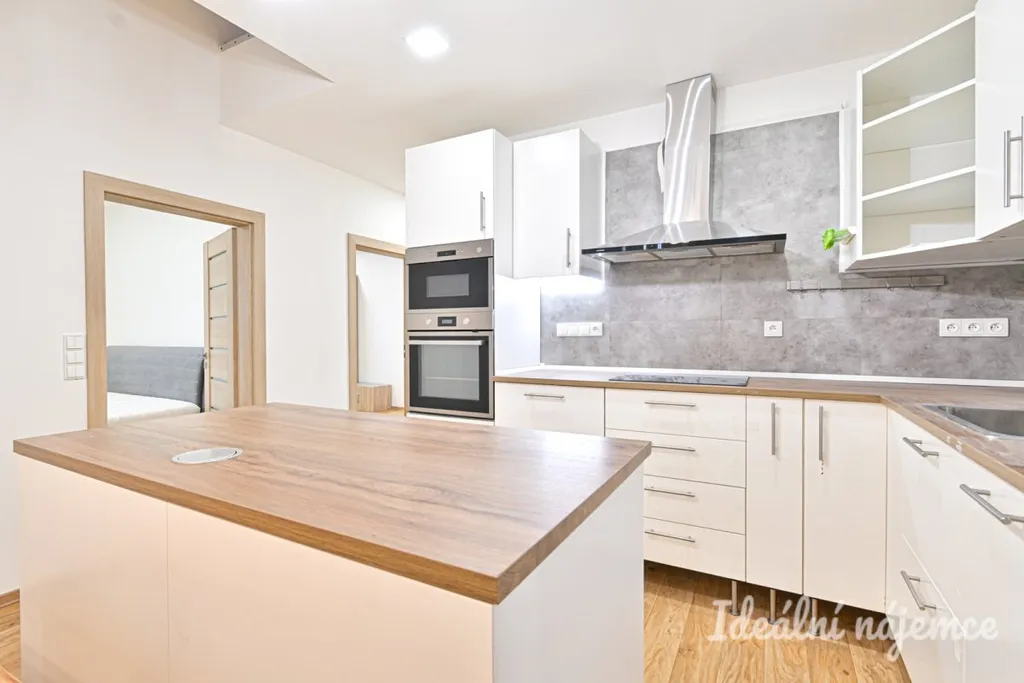 Moderní interiér bytu je ve velmi dobrém stavu. Dispozice 3+kk nabízí vzdušný obývací prostor s kuchyňským koutem a dvě samostatné místnosti vhodné jako ložnice, dětský pokoj nebo pracovna. Kuchyně je vybavena kuchyňskou linkou se spotřebiči jako trouba, mikrovlnná trouba, digestoř, lednice a myčka. Zbytek místnosti je zařízen jídelním stolem, TV skříňkou a gaučem. K dispozici je také praktická spíž na úschovu potravin. Ložnice disponuje manželskou postelí s matrací a úložným systémem. Druhá oddělená místnost vybavena malou skříňkou. V koupelně najdeme prostornou vanu, umyvadlo se skříňkou a sprchový kout. Toaleta je oddělená.