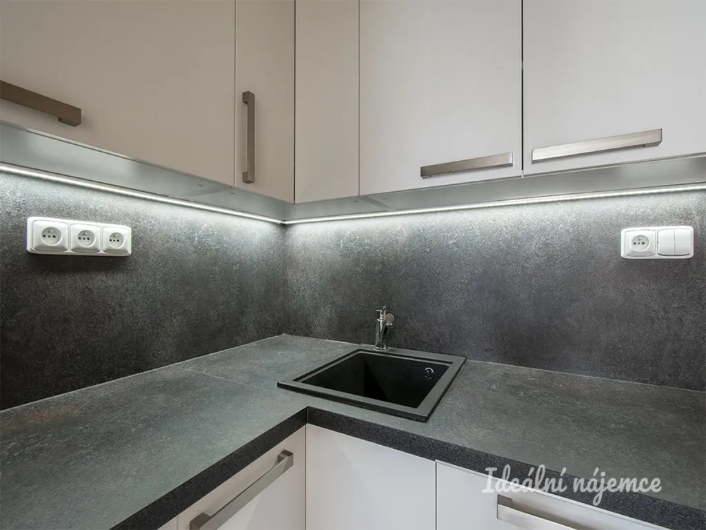 Moderní a nadstandardně vybavená kuchyňská linka disponuje indukční deskou s elektrickou troubou a digestoří, lednicí s mrazákem, mikrovlnkou a myčkou, vše značky Whirpool. Z kuchyně se vstupuje do hlavní obývací místnosti, která zároveň slouží i jako ložnice. Tato místnost je vybavena dvoulůžkovou postelí s roštem a matrací, k využití je i šatní skříň. Další částí bytu je prostorná chodba se vstupem do koupelny, která disponuje sprchovým koutem, umyvadlem se zrcadlem a skříňkou, WC a pračkou.