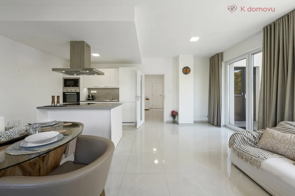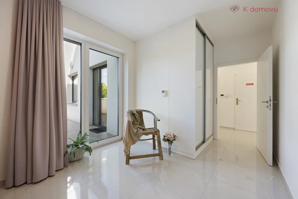 Byt nabízí prostornou vstupní halu, odkud jsou samostatné vstupy do všech místností. Velkorysý obývací pokoj s kuchyňským koutem a ostrůvkem, vytváří dokonalý rodinný a víceúčelový prostor pro různá setkávání. Přilehlá terasa je přístupná jak z obývacího pokoje, tak z ložnice, a nabízí příjemné a pohodlné místo k relaxaci či odpočinku na čerstvém vzduchu s výhledem do zeleně.