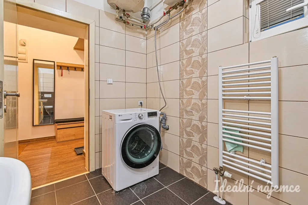 Koupelna je spojena s toaletou a je vybavena sprchovým koutem, kombinovanou pračkou se sušičkou a praktickými úložnými prostory. Součástí koupelny je rovněž kotel s bojlerem, který zajišťuje ohřev vody a vytápění.