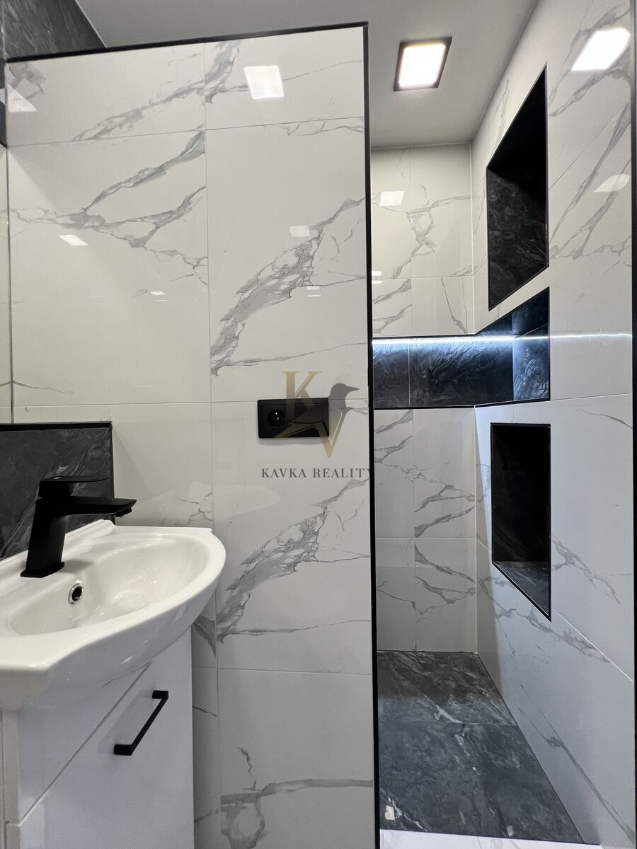 Je po kompletně moderní a nadčasově krásné rekonstrukci včetně nové kuchyňské linky s elektrospotřebiči ( sklokeramická varná deska s vestavěnou horkovzdušnou multifunkční troubou a odsavačem par vše kvalitní značky Gorenje a Whirlpool . ) Celá kuchyňská linka je v pěkném podsvícení , zabudovaného led pásku, který mění barvy. Koupelna a WC je zděná- rekonstruovaná- kde se nachází velký zděný sprchový kout osvětlený nikou s dekorativními policemi , ( ve sprše většinou poslouží jako neocenitelný úložný prostor pro šampon nebo sprchový gel, ve stěnách mimo ně slouží spíše jako police a má funkci dekorační – krásně se tady budou vyjímat květiny nebo třeba suvenýry z cest, či ručníky .) hranaté umyvadlo se skříňkou a zrcadlo zapuštěné v obkladu . Wc je závěsné značky Geberit . Krásná a kvalitní mramorová dlažba se nachází v kuchyni , chodbě v koupelně a na Wc . Ve zbylém pokoji se nachází plovoucí podlaha .