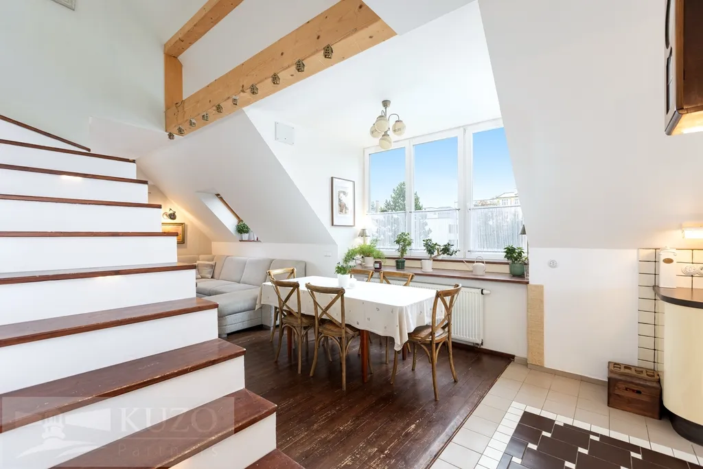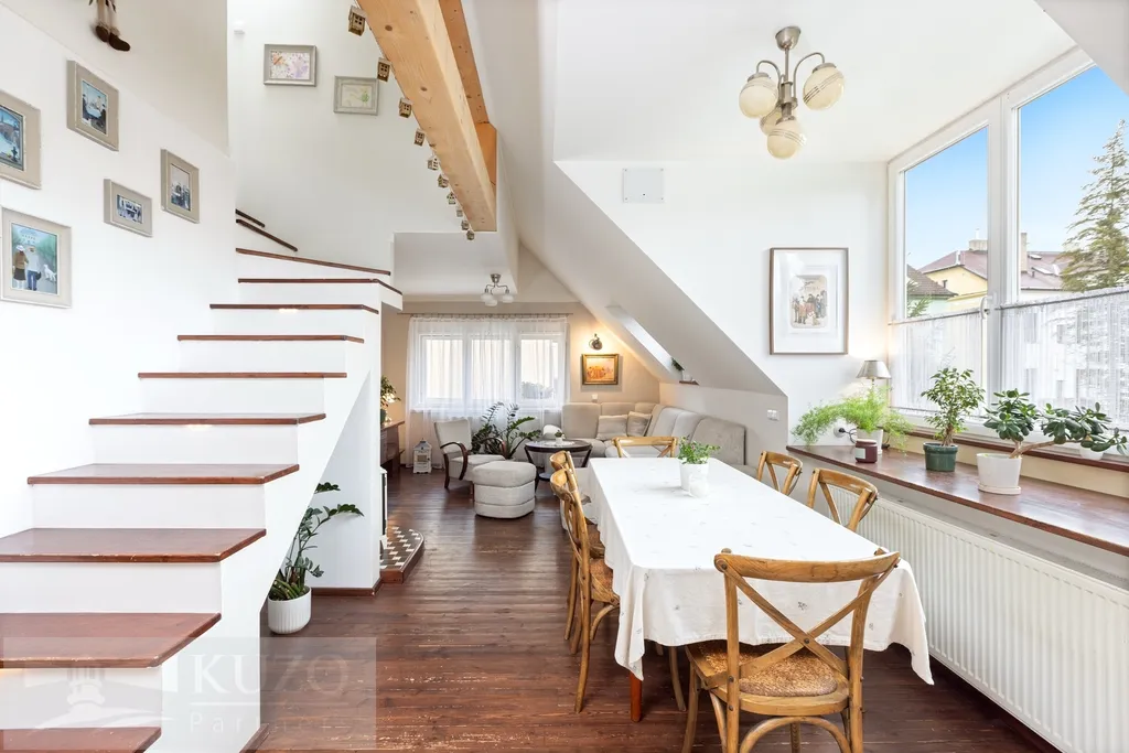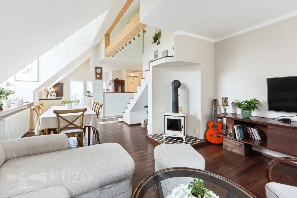 Nabízíme ke koupi výjimečný mezonetový byt o užitné ploše 109 m², nacházející se ve 3. nadzemním podlaží komorního bytového domu s pouhými třemi bytovými jednotkami, v klidné a velmi vyhledávané lokalitě ulice Boženy Němcové v centru Mladé Boleslavi. Jedná se o byt s opravdu jedinečným charakterem, který zaujme svou otevřeností, dostatkem přirozeného světla a krásnými výhledy do zeleně za domem, přičemž atmosféru obývacího prostoru podtrhují stylová krbová kamna.