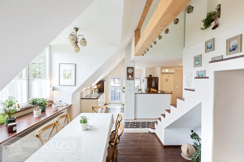 Z obývací části vedou schody do horního patra mezonetu, kde se nachází další dva pokoje a místnost s přípravou na druhou koupelnu s WC, což nabízí možnost dalšího komfortního rozšíření bydlení dle vlastních potřeb.