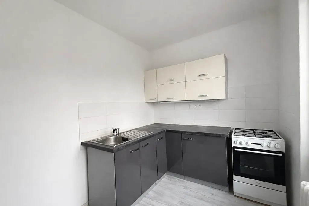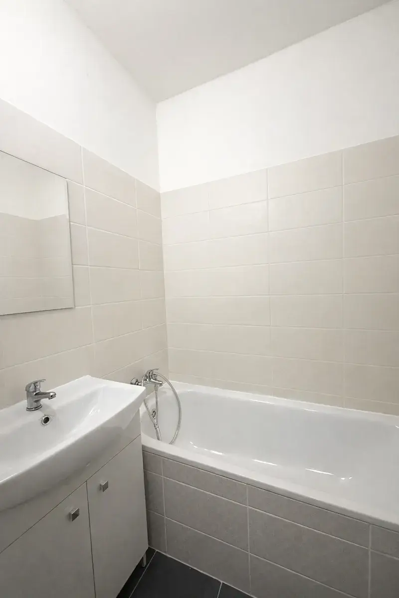 Byt je částečně vybaven kuchyňskou linkou s kombinovaným sporákem. Koupelna je vybavena vanou, umyvadlem se skříňkou, toaleta je oddělená.