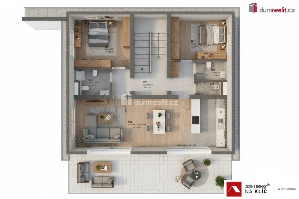 Dům o dispozici 5+kk s promyšleným dvoupodlažním uspořádáním poskytuje dostatek soukromí a prostoru pro velkou rodinu.