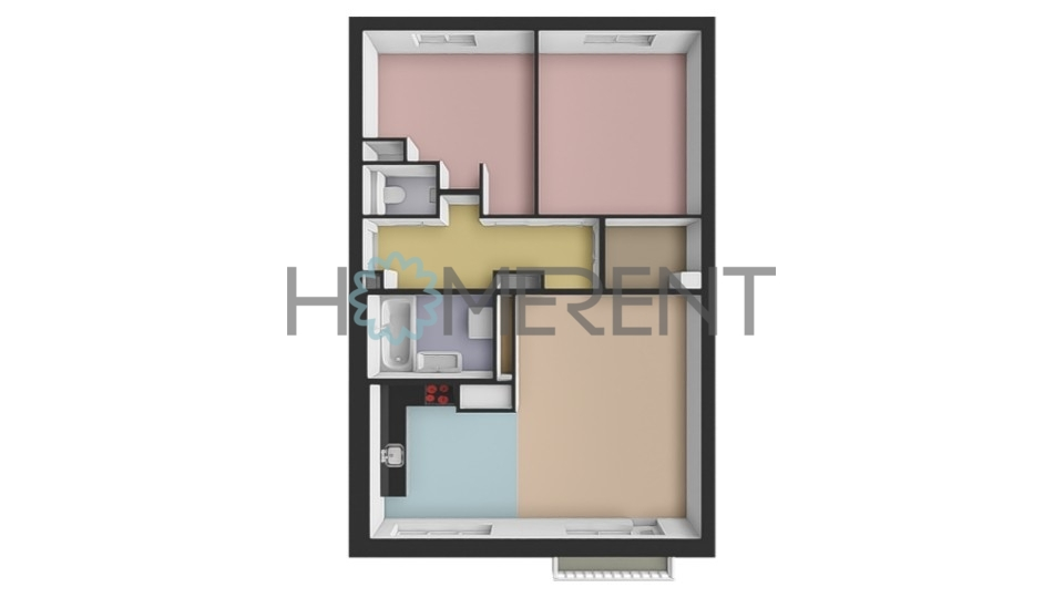Dispozice bytu tvoří prostorný obývací pokoj s TV a kuchyňským koutem, kuchyně s jídelním stolem pro čtyři osoby, dvě neprůchozí ložnice s manželskými postelemi, koupelna s vanou a pračkou, oddělené WC, komora a malý balkon orientovaný do ulice.