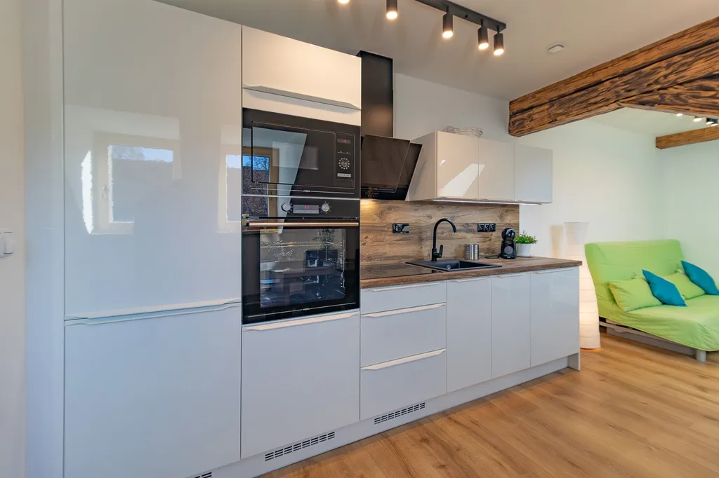 Apartmán č. 4. o podlahové ploše 47,8 m2 je kompletně moderně a vkusně vybavený jak elektrospotřebiči, tak nábytkem. Vnitřní dispozice 2+kk v 1. NP: vstupní předsíň, kuchyňský kout - kuchyňská linka zn. Oresi ( s el. horkovzdušnou troubou s indukční deskou, mikrovlnnou troubou, lednicí s mrazákem zn. Mora). Jídelní koutek s obývacím prostorem včetně nábytku a TV ; ložnice. Koupelna (se sprchovým koutem, umyvadlem, topným žebříkem a připojením k pračce, baterie – Grohe, sanita - Geberit), samostatné WC. V rámci rekonstrukce bylo provedeno zaizolování stropů, položeny protihlukové podlahy, plovoucí podlaha zn. Quick – Step a protihlukové stěny mezi apartmány, okna dřevěná s trojskly. Vytápění je řešeno klimatizací Haier - ovládanou tel., vjezdová brána ovládaná tel. a kódovým systémem, samostatné připojení wifi, kamerový systém. K bytu náleží vlastní venkovní prostor k posezení, kój (5m2), jedno parkovací stání u domu a společné venkovní prostory k odpočinku. Voda čerpána z vrtané studny, odpad řešen ČOV. V rezidenci je dále k dispozici využití sauny a fitness.