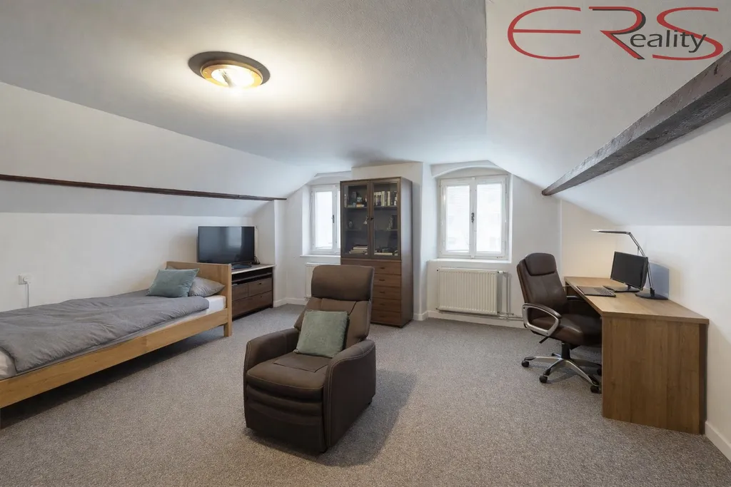 podkroví tvoří dvě bytové jednotky. Podkroví má atmosféru „dům s duší“ potvrzenou i realitou: šikminy, přiznané trámy, okna do náměstí… a ano, momentálně i běžný provoz života (čti: žádná katalogová sterilita, ale reálný stav).