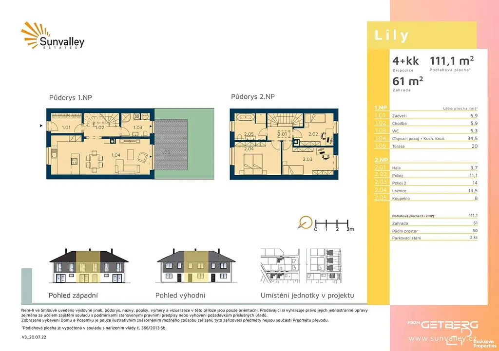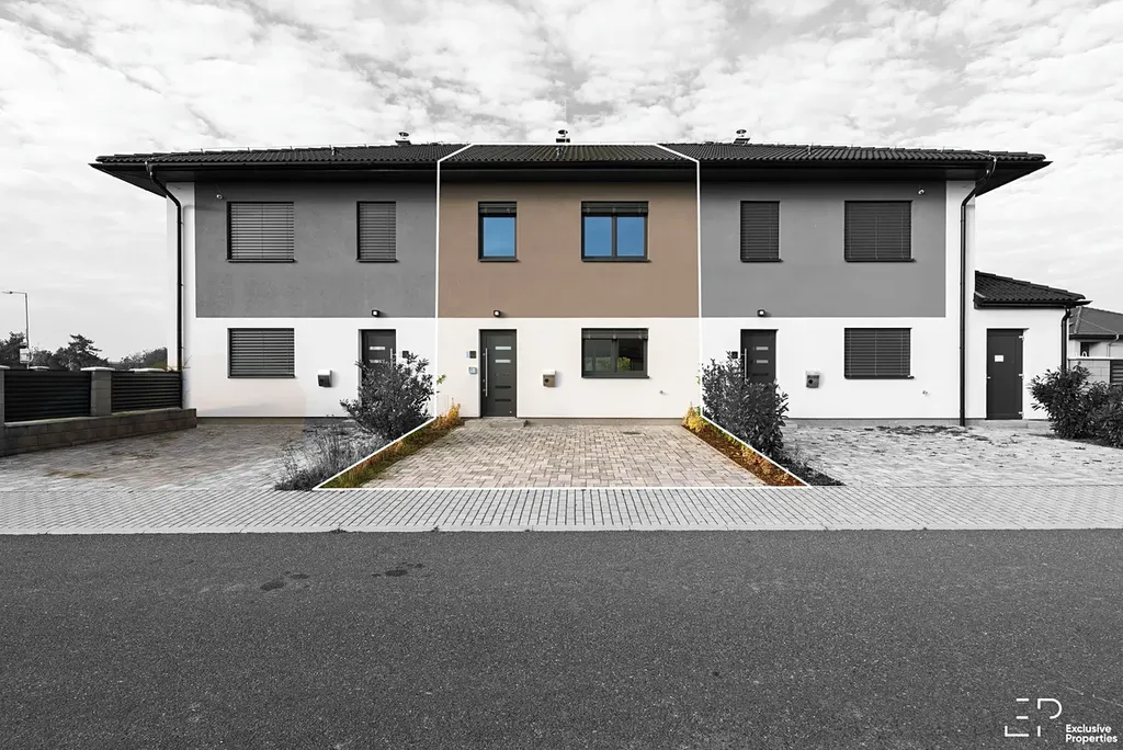 Podlahová plocha 111 m², zahrada 61 m² s terasou, před domem plocha pro 2 parkovací místa (wallbox pro elektromobil).
