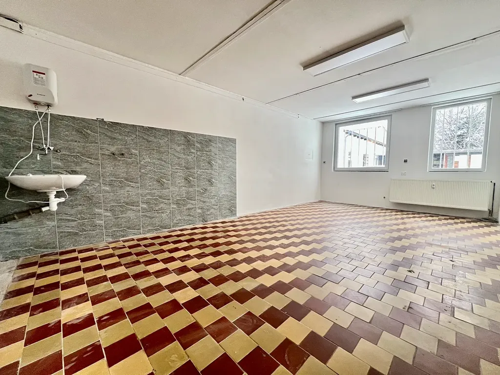 Prostor je rozdělen do třech částí. Nejmenší část slouží jako zázemí/kancelář, kde je umyvadlo, další dvě části jsou připraveny k jakémukoli využití - sklad, výroba, obchodní prostory, atd...