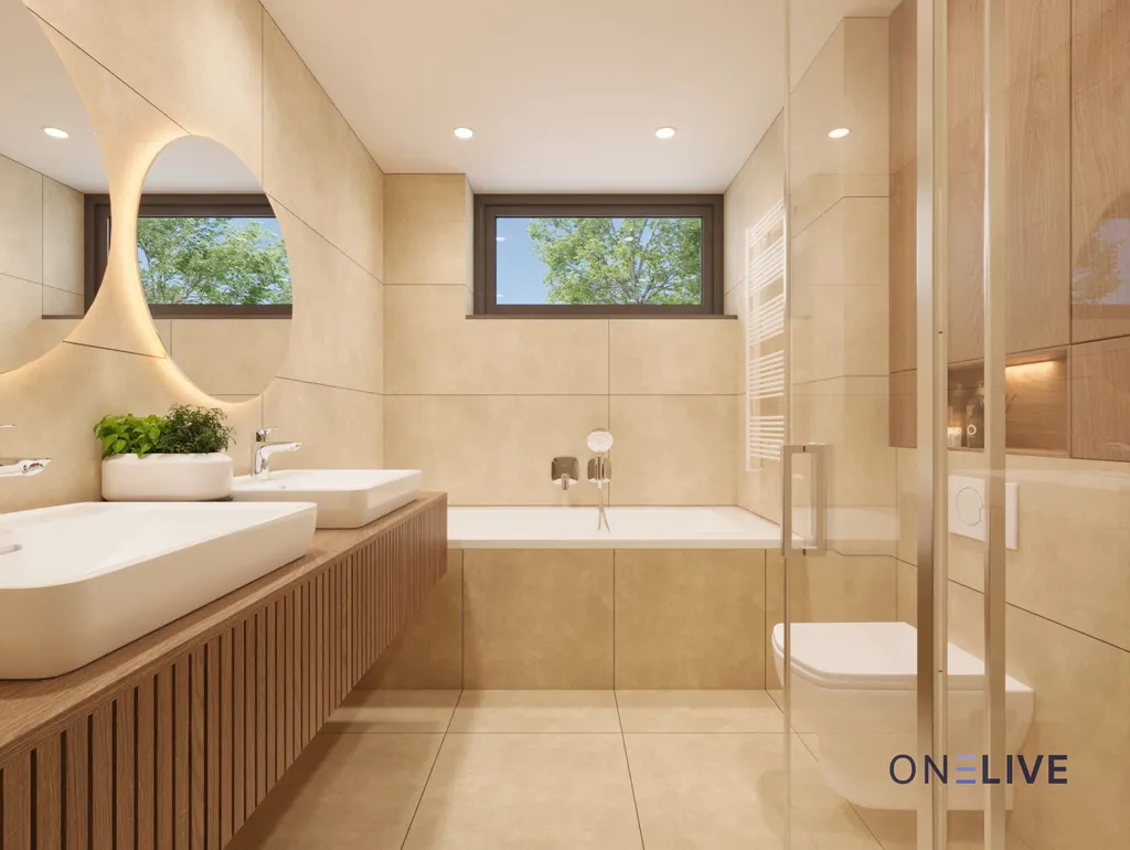 Nabízené dvojdomy s garáží mají podlahovou plochu 107,56 m² a garáž pro jedno vozidlo o velikosti 21,27 m² s možností úložného prostoru, terasu a závětří o celkové výměře 20,20 m² a pozemky o velikosti 303 m² a 343 m². Dispozičně jsou řešeny v 1. nadzemním podlaží obývacím prostorem s kuchyňským koutem a přímým vstupem na terasu, přičemž součástí kuchyňského koutu je také samostatná spíž sloužící jako praktický úložný prostor pro potraviny. Dále se zde nachází koupelna se sprchovým koutem, toaletou, umývátkem a technickým zázemím. Do 2. nadzemního podlaží vede železobetonové schodiště, kde jsou umístěny dva dětské pokoje, ložnice a druhá koupelna s vanou, dvojumyvadlem a toaletou. V první etapě projektu jsou k dispozici pouze dva dvojdomy s garáží.