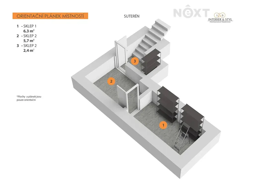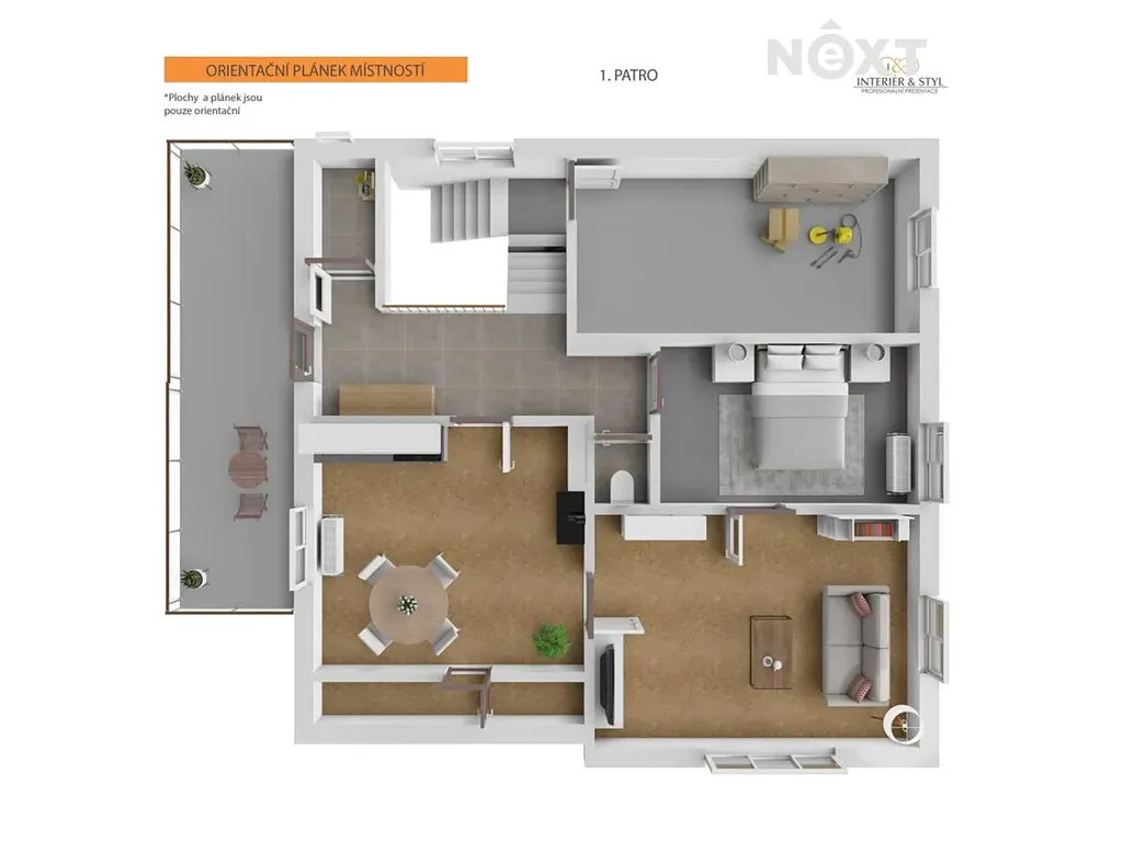 Ve 2.NP. je další bytová jednotka 2+1 (kuchyň, obývací pokoj, ložnice), koupelna a wc, 2 komory a spíž.