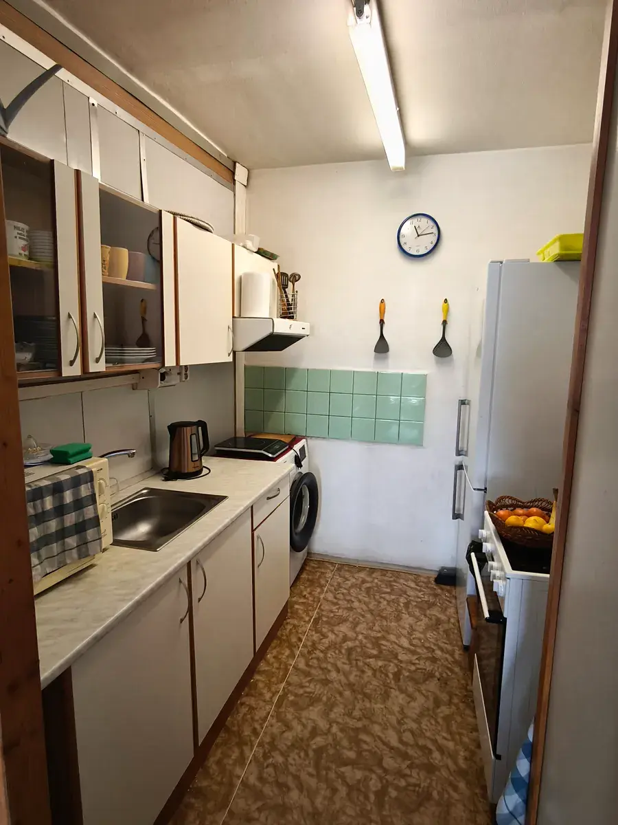 V bytě se nachází vstupní chodba se vstupem do koupelny a WC. Dále ložnice, obývací pokoj a kuchyňský kout. K bytu náleží sklep v suterénu domu. Byt je v původním udržovaném stavu vhodný jako investice, nebo startovací bydlení. V bytě je v současné bezproblémový nájemník. Případné prodloužení nájemního vztahu je možné.