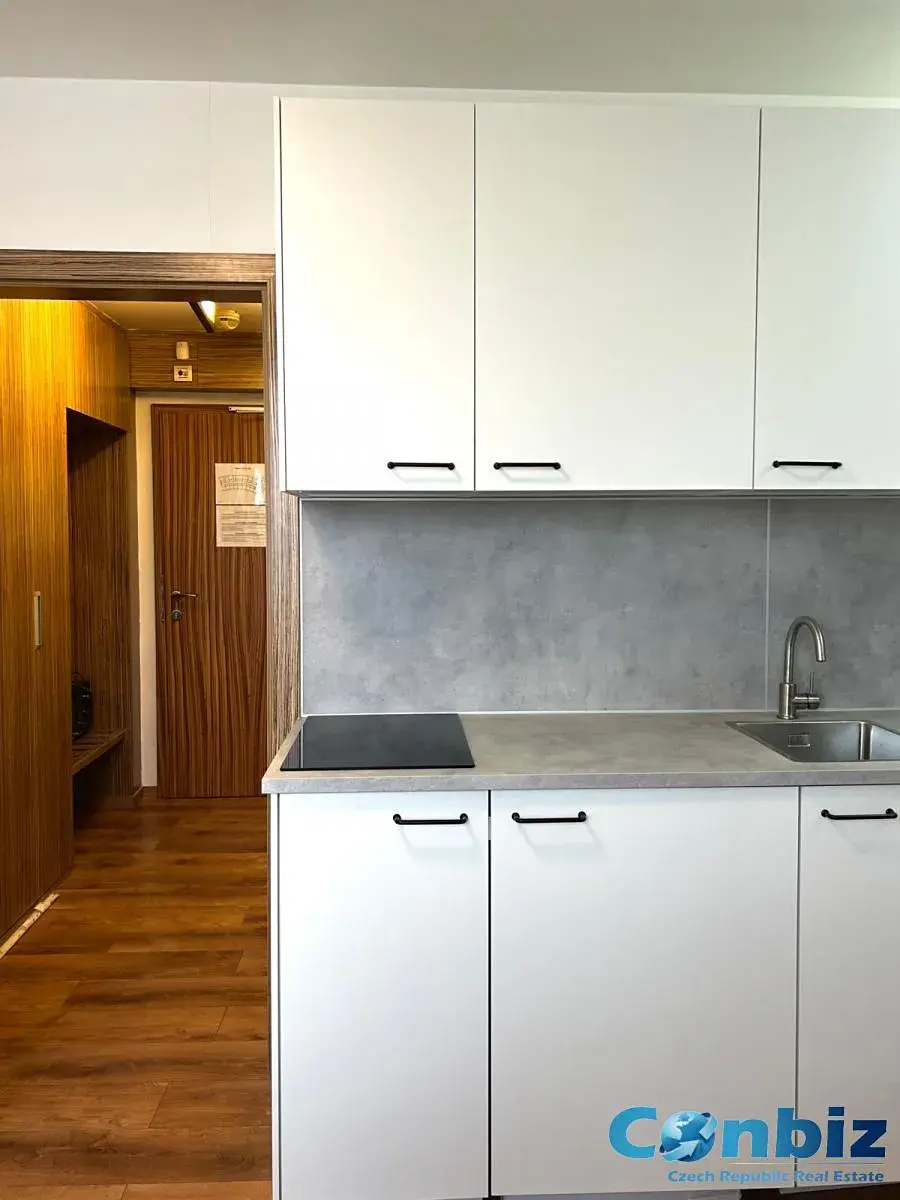 Nabízíme k pronájmu moderně řešený pokoj, který je díky svému uspořádání se dvěma oddělenými lůžky a dvěma pracovními stoly ideální volbou zejména pro studenty. Součástí interiéru je plně vybavený kuchyňský kout, kde naleznete sklokeramickou varnou desku, mikrovlnnou troubu, dřez i kompaktní hotelovou lednici. Praktickým doplňkem kuchyňské linky je také zabudovaná pračka.