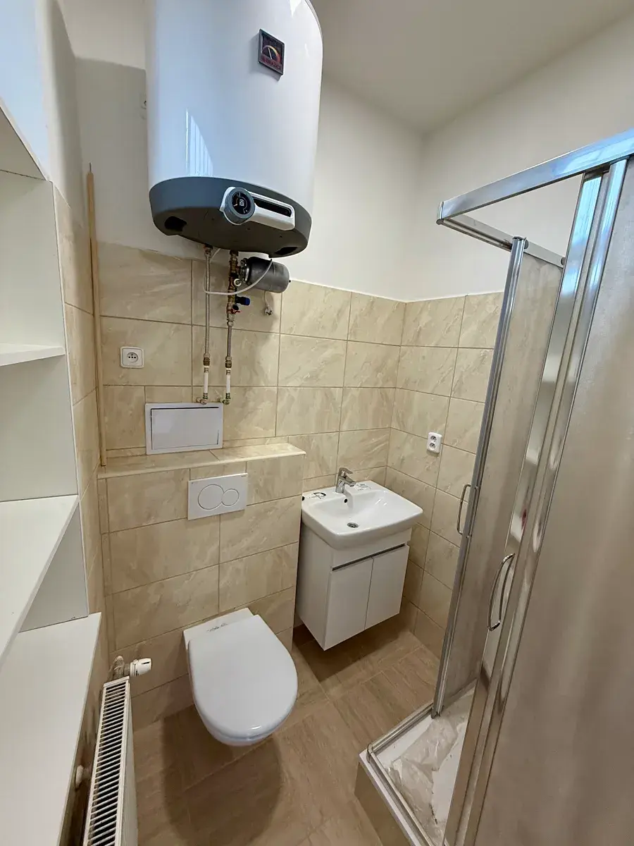 Při vstupu do bytu je vstupní místnost s kuchyňskou linkou s pračkou, lednicí, el. indukčním vařičem a mikrovlnnou troubou, světlý obytný pokoj není zařízen. V koupelně se nachází sprchový kout s WC.