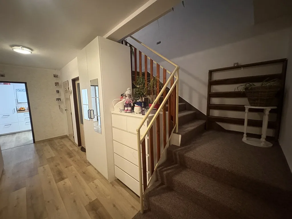 Dispozice: vstupní zádveří, chodba, spojený prostor obývacího pokoje a jídelny se vstupem na zahradu, kuchyň, WC. Dále schodiště do patra, kde je prostorná koupelna s vanou, WC, 3 pokoje, šatna, prostor pro pracovnu na chodbě.