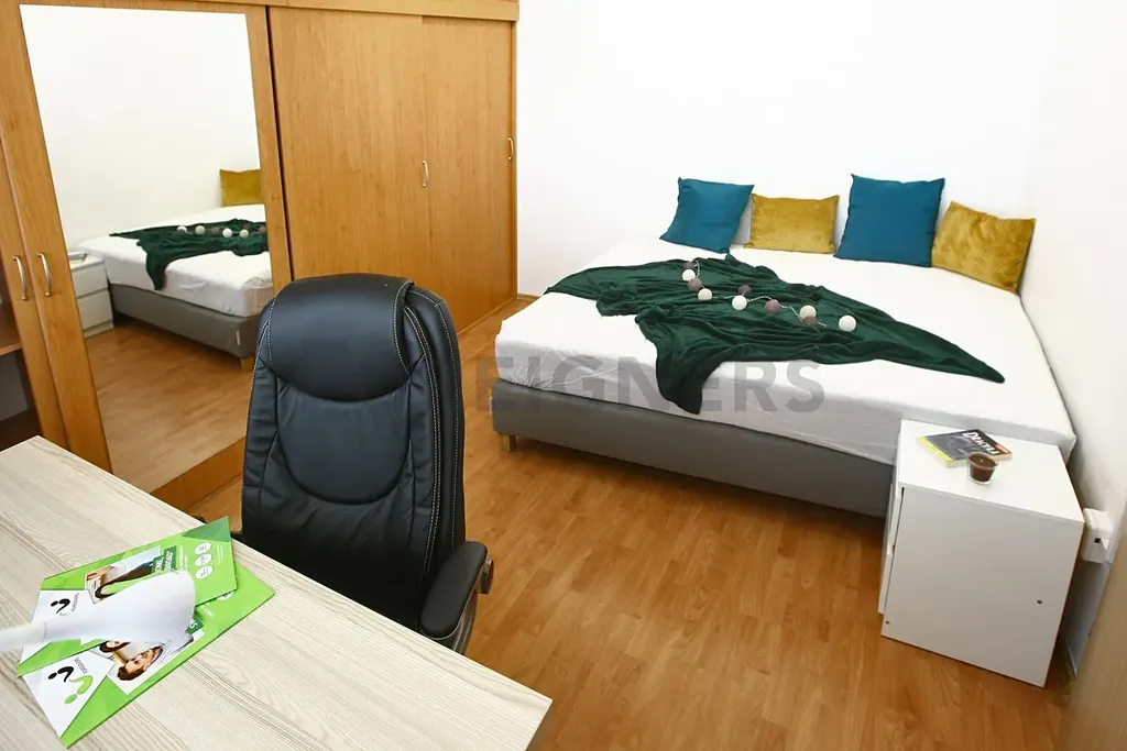 Byt se skládá ze dvou samostatných pokojů vybavených psacím stolem, židlí, postelí a skříní, průchozího obývacího pokoje se sedací soupravou, konferenčním stolem, TV, TV stolkem, jídelním stolem se židlemi.