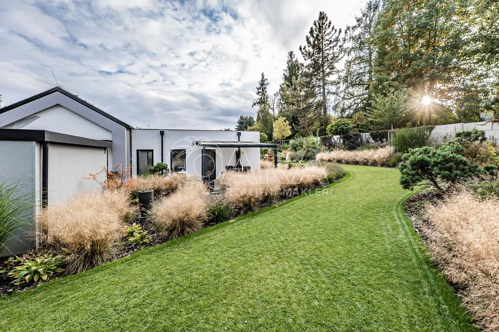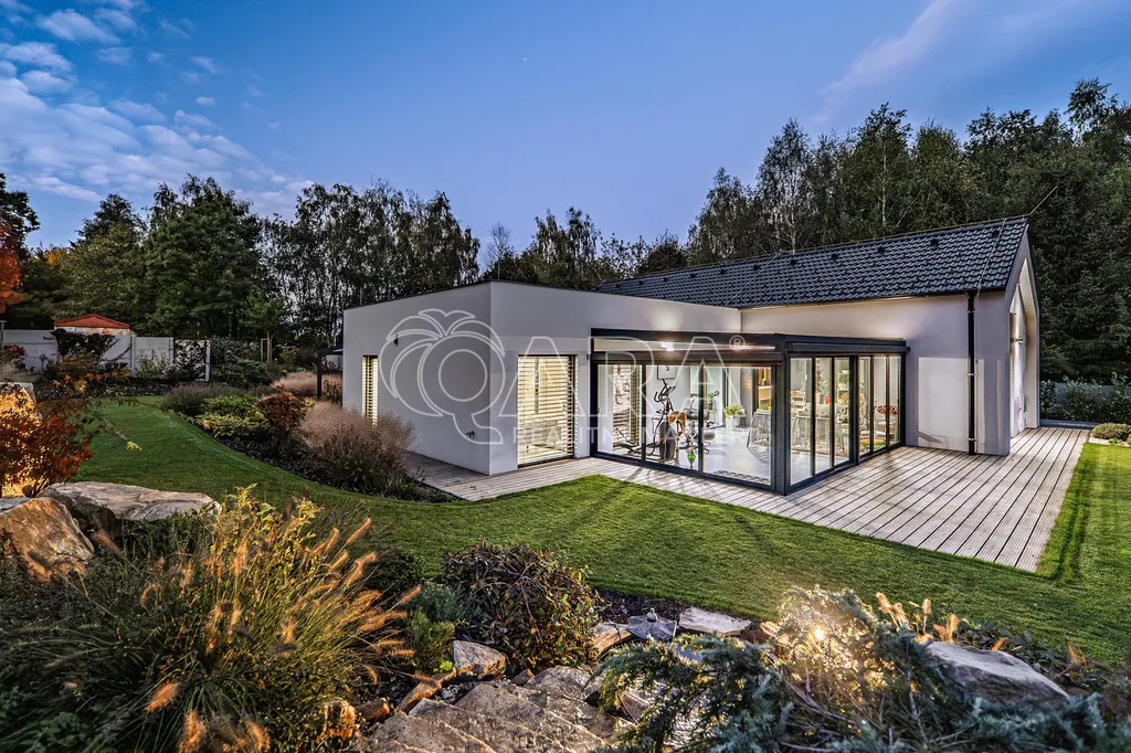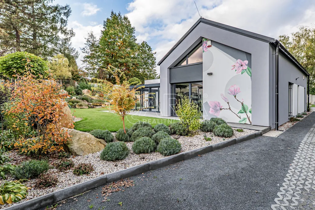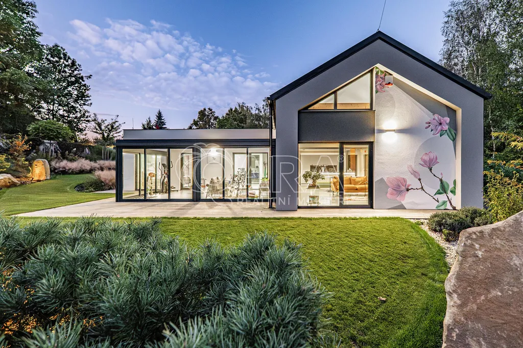 Zprostředkujeme Vám ke koupi moderní, reprezentativní, designový, maximálně funkční vilový bungalov (dřevostavba) s obytnou plochou 145 m2, se zimní a architektonickou zahradou, situovaný v nejprestižnější části Kamenice – Štiřín, v klidové zóně u zámku a golfového hřiště. Tento výjimečný dům je vystavěn na pozemku o celkové ploše 1 205 m2 a byl kolaudován v roce 2023. Dominantou stavby je originální ručně malovaná fasáda od akademického malíře, která domu dodává naprosto jedinečný charakter a činí jej skutečným designovým originálem. Parcela je bez přímých sousedů, vzrostlé stromy vytvářejí přirozené soukromí i mikroklima – ráno vás probudí ticho a zeleň, večer si užíváte jemně nasvícenou zahradu místo pohledů do cizích oken.