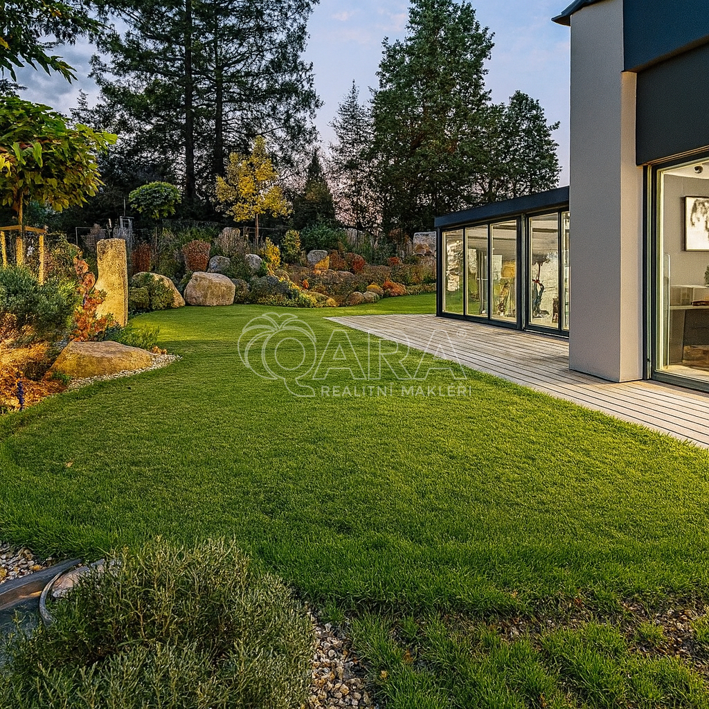 Vodní kaskáda, LED osvětlení, bonsaje a solitérní stromy, terasy, automatická závlaha, profesionální modelace terénu a výsadba zajišťující absolutní soukromí. Celek působí jako soukromý resort.