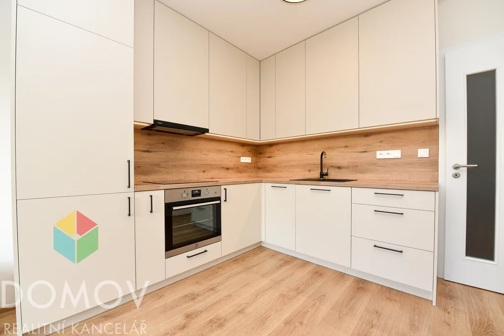 Dispozice bytu zahrnuje prostornou vstupní chodbu ,která bude osazena šatními skříněmi, koupelnu se sprchovým koutem, toaletou, umyvadlem a otopným žebříkem, samostatnou ložnici a obývací pokoj s kuchyňským koutem. Ten je vybaven nadstandardní kuchyňskou linkou s indukční varnou deskou, myčkou, digestoří, dřezem a vestavěnou lednicí s mrazákem. Součástí vybavení je rovněž jídelní stůl se židlemi, pohovka, konferenční stolek a televizní skříňka. Okna jsou osazena venkovními roletami.